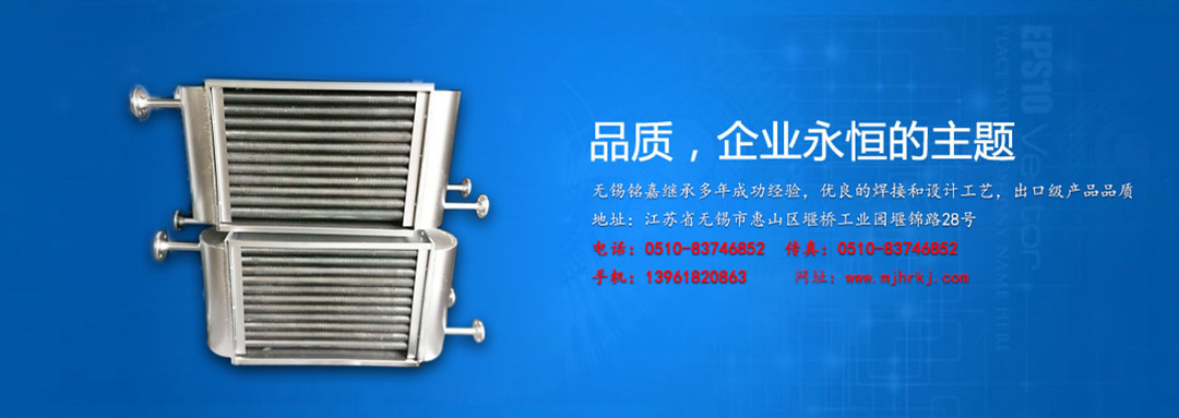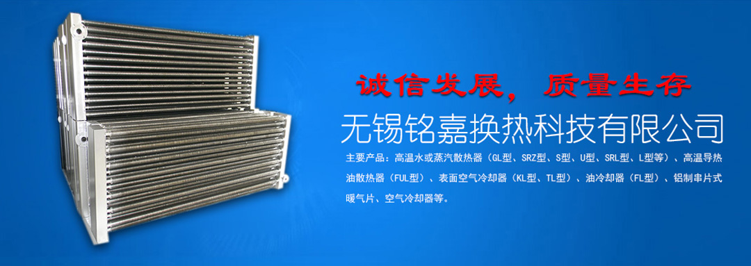 無錫銘嘉換熱科技有限公司是生產散熱器的專業工廠。 產品有:高溫水或蒸汽散熱器、高溫導熱油散熱器、表面空氣冷卻器油冷卻器、鋁制串片式暖氣片空氣冷卻器、翅片管換熱器